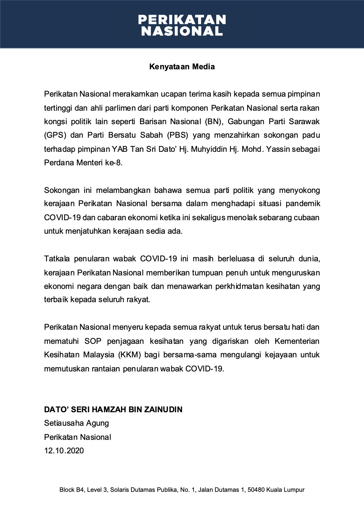 Emmanuelsamarathisa On Twitter Just In Perikatan Nasional Thanks Its Allies Such As Barisan Nasional Gabungan Parti Sarawak And Parti Bersatu Sabah For Their Unwavering Support For Prime Minister Muhyiddin Yassin On The