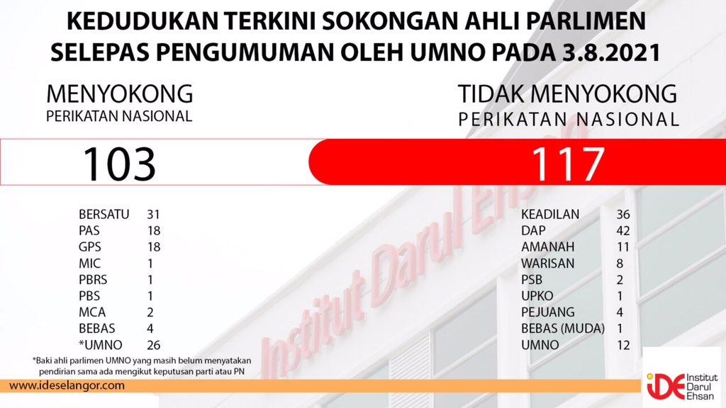 Jika garis penamat adalah 111 Perikatan Nasional PN yang mempunyai 100 kerusi. Walau bagaimanapun 2 ahli parlimen meninggal dunia dan pilihan raya kecil belum diadakan maka jumlah ahli parlimen pada waktu ini ialah 220 ahli parlimen. KUALA LUMPUR Sept 28.