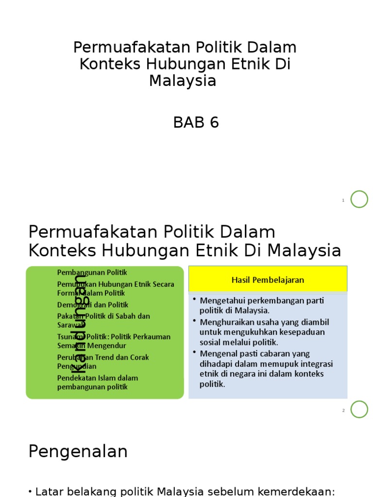 Check more flip ebooks related to PERMUAFAKATAN POLITIK DALAM KONTEKS HUBUNGAN ETNIK DI MALAYSIA of. BAB 5 Permuafakatan Politik dalam Konteks Hubungan Etnik di Malaysia Selepas mempelajari bab ini pelajar dapat. Pelbagai dugaan dan cabaran yang dilalui dengan penuh kesulitan oleh pemimpin dan generasi terdahulu.